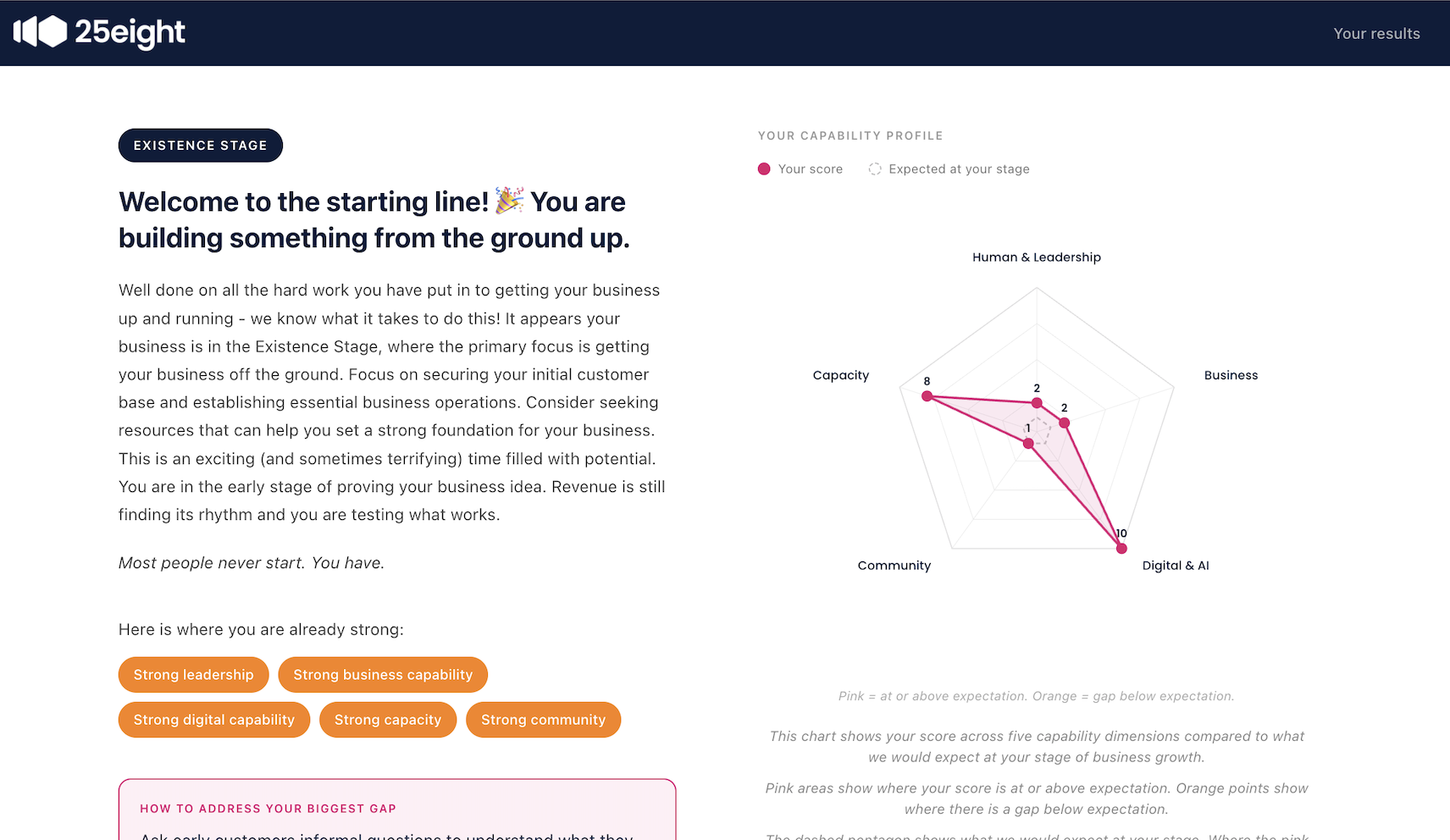 The result isn't a generic report. It's a personalised capability profile that includes your growth stage, your strongest areas, your priority gap, your AI readiness, and a specific recommendation for what to focus on now to help your business.