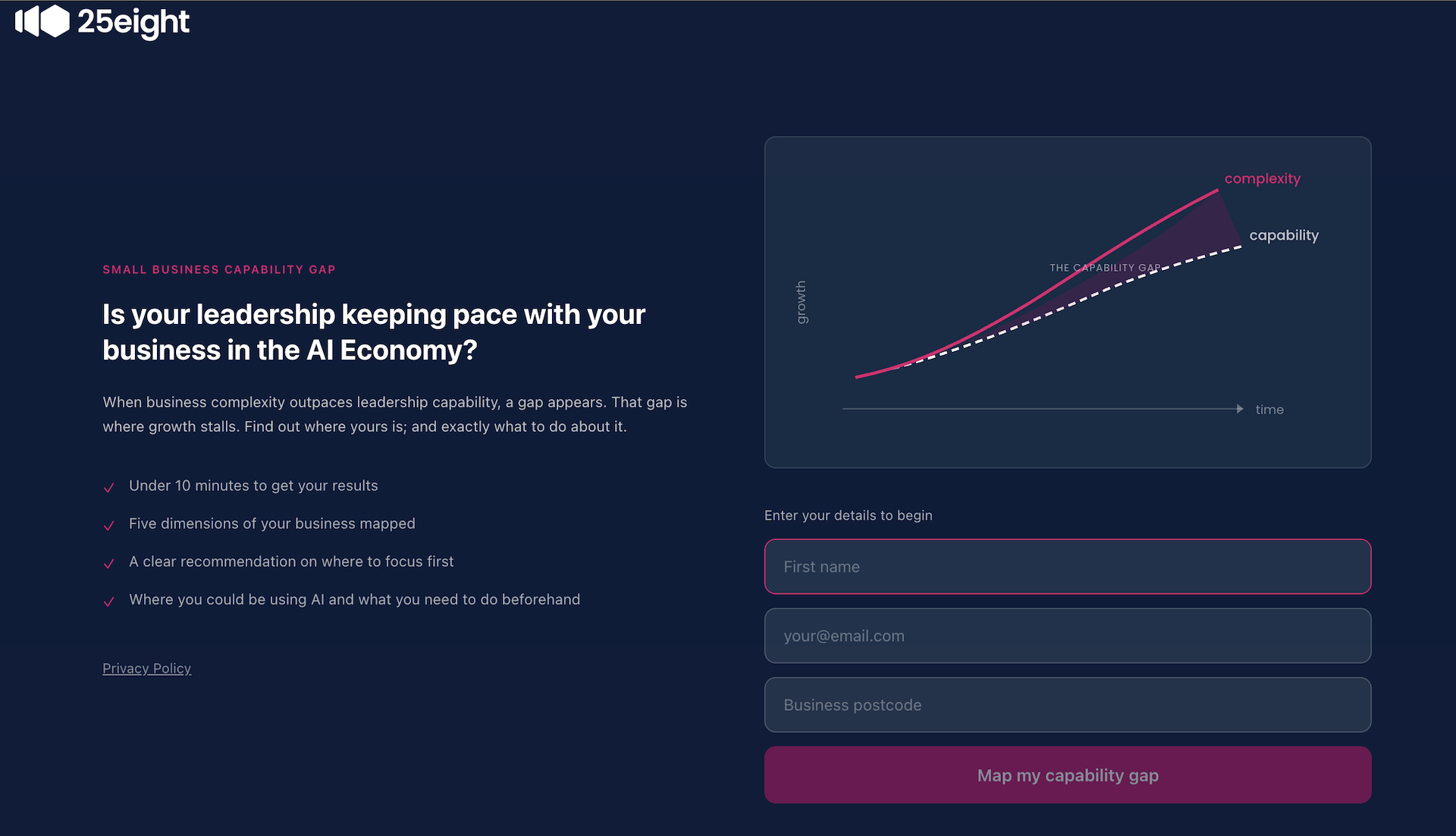 The Small Business Capability Gap is a free, structured diagnostic that takes 8 minutes to complete and gives you an honest picture of your business across five key areas; with a personalised result and a clear recommended next step.